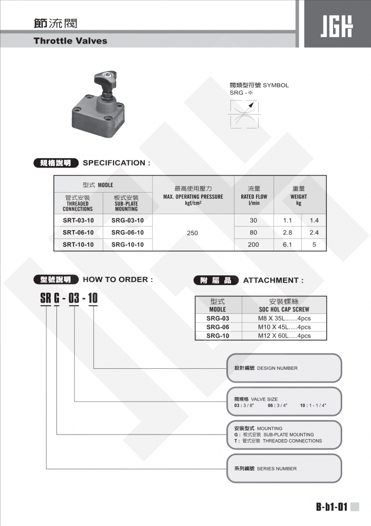 規(guī)格說明 型式 最高使用壓力 kgf/cm?2 流量 l/min 重量 kg 管式安裝 板式安裝 SRT-03-10 SRG-03-10 250 30 1.1 1.4 SRT-06-10 SRG-06-10 80 2.8 2.4 SRT-10-10 SRG-10-10 200 6.1 5 JGH節(jié)流閥常規(guī)型號(hào)參考:SRG-03-10 , SRG-06-10 , SRG-10-10 , SRT-03