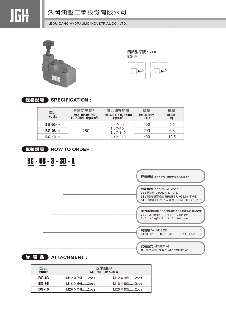 規(guī)格說明 型式 最高使用壓力 kgf/cm2 壓力調(diào)整範(fàn)圍 kgf/cm2 流量 l/min 重量 kg BG-03-※ 250 0 :?7-35 1 :?7-70 2 :?7-140 3 :?7-210 100 5.5 BG-06-※ 200 6.8 BG-10-※ 400 10.5 JGH先導(dǎo)式溢流閥常規(guī)型號(hào)參考:BG-03-0 , BG-03-1 , BG-03-2 , BG-03-3 ,