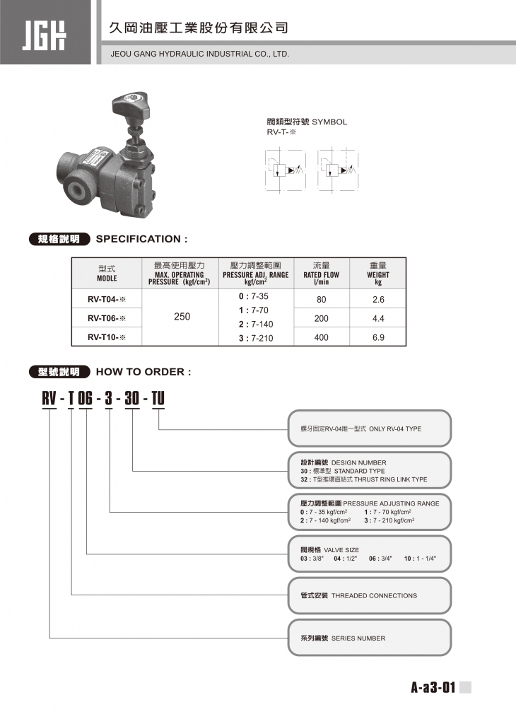 JGH先導式溢流閥常規(guī)型號參考:RV-T03-1,RV-T03-2,RV-T03-3,RV-T04-1,RV-T04-2,RV-T04-3,RV-T06-1,RV-T06-2,RV-T06-3,RV-T10-1,RV-T10-2,RV-T10-3