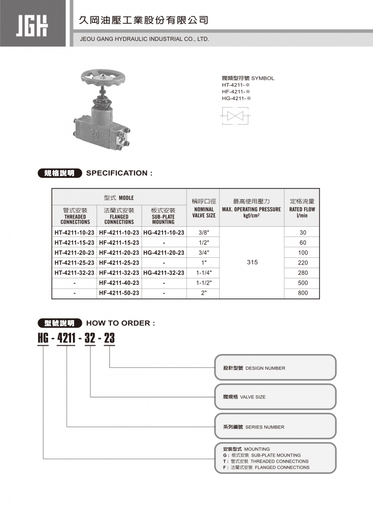 JGH中止閥常規(guī)型號(hào)參考:HT-4211-32-23 , HT-4211-25-23 , HT-4211-20-23 , HT-4211-15-23 , HT-4211-10-23 , HG-4211-32-23 , HG-4211-20-23 , HG-4211-10-23 , HF-4211-50-23 , HF-4211-40-23 , HF-4211-32-23 , HF-4211-25-23 , HF-4211-20-23 , HF-4211-15-23 , HF-4211-10-23