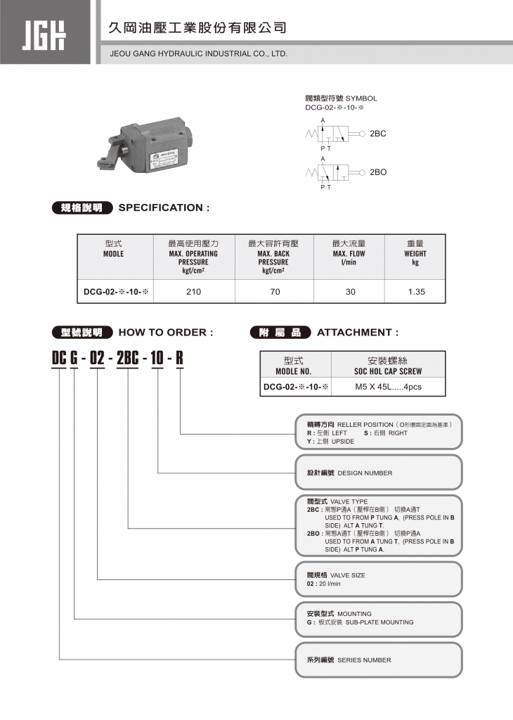 JGH凸輪行程換向閥常規(guī)型號參考:DCG-02-2BC-10-R , DCG-02-2BC-10-S , DCG-02-2BC-10-Y , DCG-02-2BO-10-R , DCG-02-2BO-10-S , DCG-02-2BO-10-Y