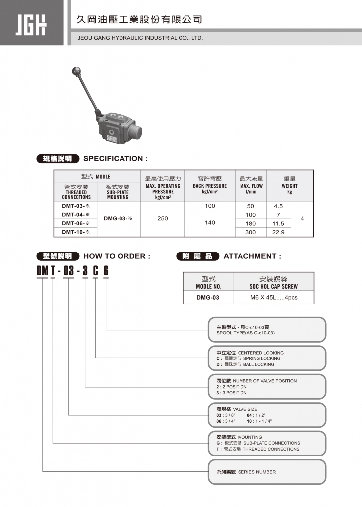 規(guī)格說明 型式 最高使用壓力 kgf/cm2 最大流量 kgf/cm2 最大流量 l/min 重量 kg 管式安裝 板式安裝 DMT-03-※ DMG-03-※ 250 100 50 4.5 4 DMT-04-※ 140 100 7 DMT-06-※ 180 11.5 DMT-10-※ 300 22.9 JGH手動換向閥常規(guī)型號參考:DMG-03-2-C , DMG-03-2-D , DMG-03