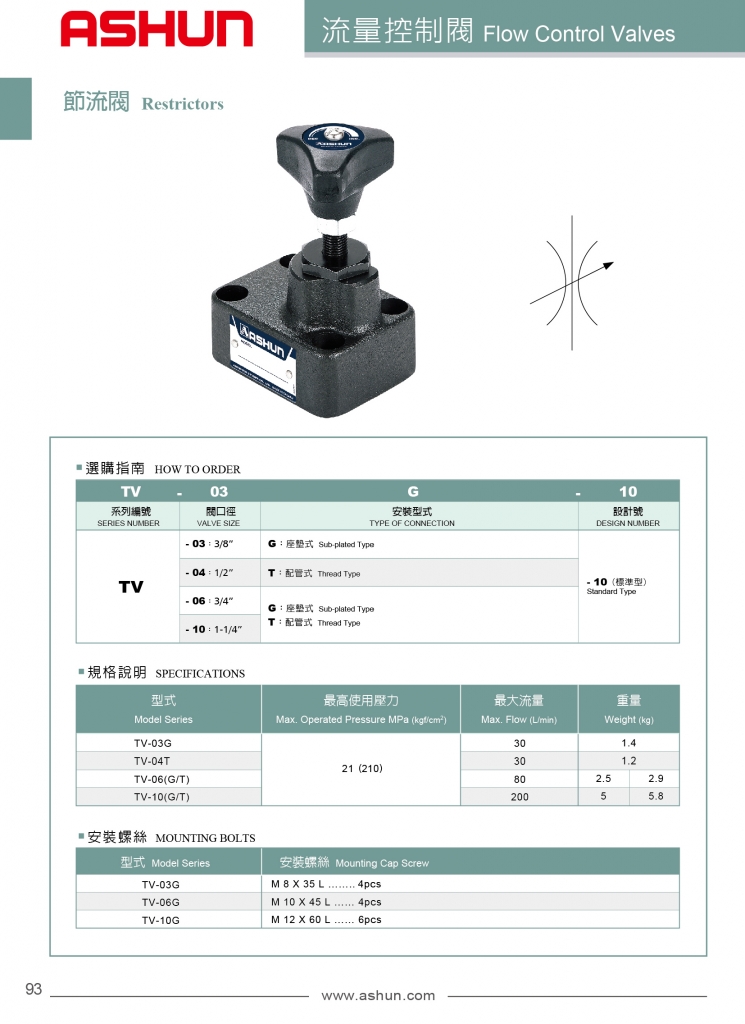 ASHUN節(jié)流閥常規(guī)型號參考:TV-03G-10 , TV-04T-10 , TV-06G-10 , TV-06T-10 , TV-10G-10 , TV-10T-10