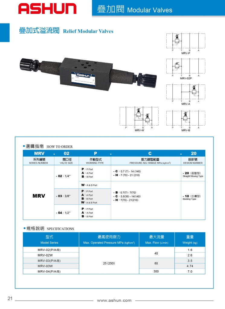 ASHUN疊加式溢流閥常規(guī)型號參考:MRV-02A-C-20 , MRV-02A-H-20 , MRV-02B-C-20 , MRV-02B-H-20 , MRV-02P-C-20 , MRV-02P-H-20 , MRV-03A-B-10 , MRV-03A-C-10 , MRV-03A-H-10 , MRV-03B-B-10 , MRV-03B-C-10 , MRV-03B-H-10 , MRV-03P-B-10 , MRV-03P-C-10 , MRV-03P-H-10 , MRV-03W-B-10 , MRV-03W-C-10 , MRV-03W-H-10 , MRV-04A-B-10 , MRV-04A-C-10 , MRV-04A-H-10 , MRV-04B-B-10 , MRV-04B-C-10 , MRV-04B-H-10 , MRV-04P-B-10 , MRV-04P-C-10 , MRV-04P-H-10