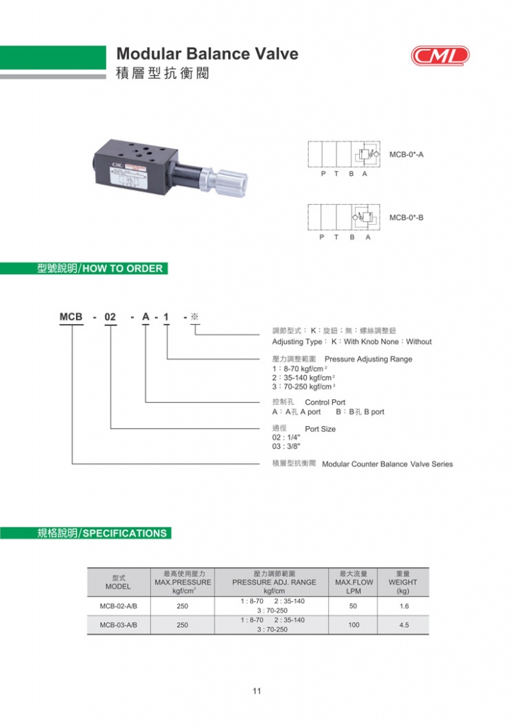 CML全懋疊加閥 積層型抗衡閥 MCB-02,MCB-03系列