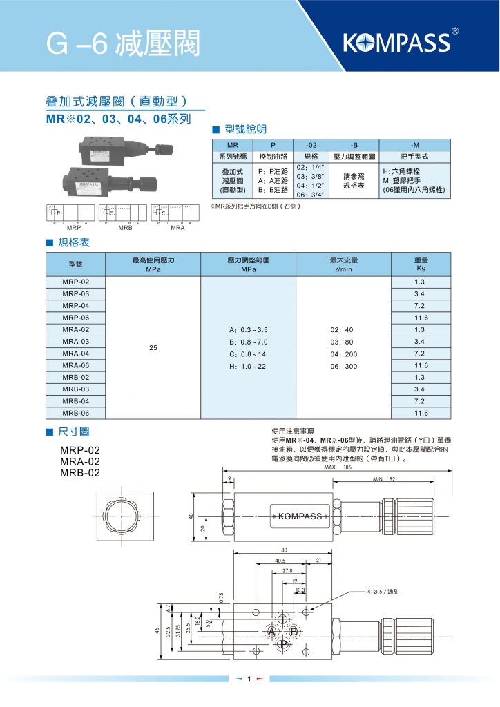 KOMPASS康百世疊加閥 MRP,MRA,MRB-02,03,04,06系列疊加式直動型減壓閥