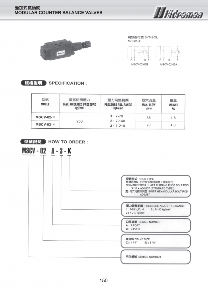 HIDRAMAN疊加式抗衡閥部分常規(guī)型號(hào)參考:MSCV-02A-1 , MSCV-02A-1-K , MSCV-02A-2 , MSCV-02A-2-K , MSCV-02A-3 , MSCV-02A-3-K , MSCV-02B-1 , MSCV-02B-1-K , MSCV-02B-2 , MSCV-02B-2-K , MSCV-02B-3 , MSCV-02B-3-K , MSCV-03A-1 , MSCV-03A-1-K , MSCV-03A-2 , MSCV-03A-2-K , MSCV-03A-3 , MSCV-03A-3-K , MSCV-03B-1 , MSCV-03B-1-K , MSCV-03B-2 , MSCV-03B-2-K , MSCV-03B-3 , MSCV-03B-3-K