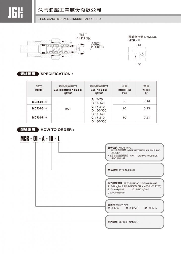 規(guī)格說明 型式 最高使用壓力 kgf/cm2 最高設(shè)定壓力 kgf/cm2 流量 l/min 重量 kg MCR-01-※ 350 A:7-70 B:7-140 C:7-210 D:30-350 2 0.13 MMCR-03-※ 20 0.13 MCR-07-※ B:7-140 C:7-210 D:30-350 60 0.21
