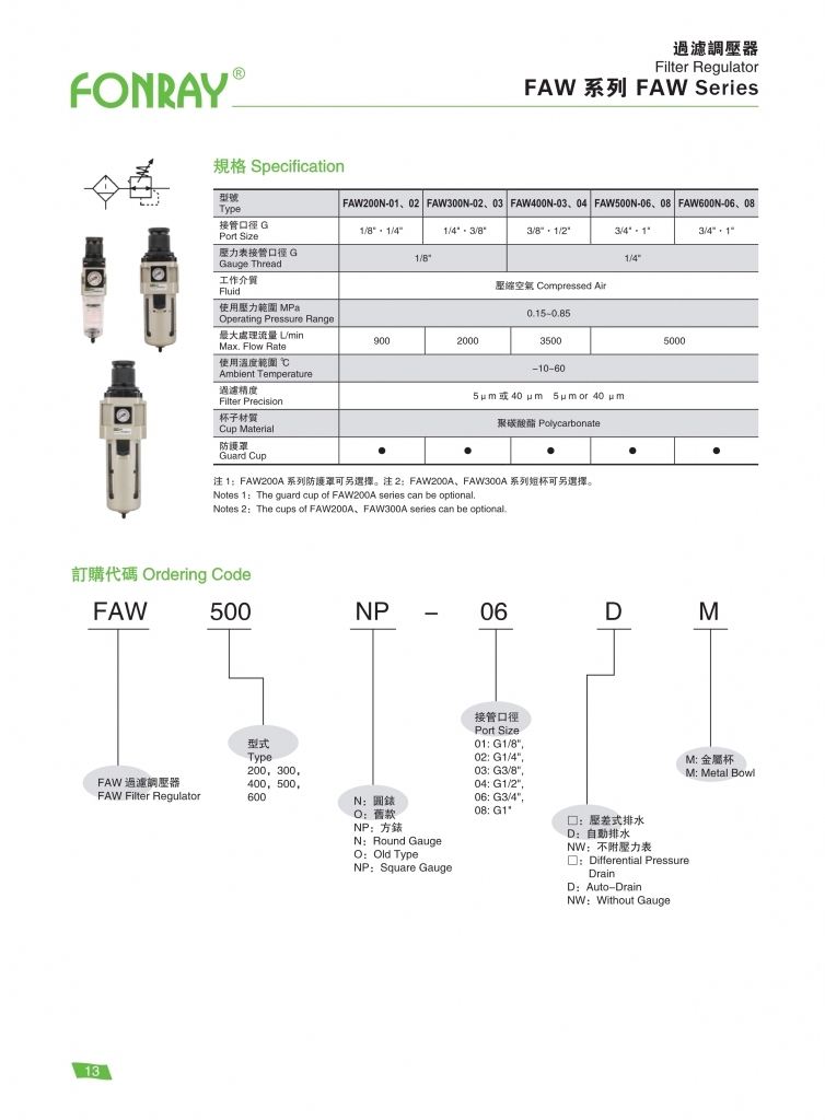過濾調(diào)壓閥 – FAW 型號 接管口徑 (G/PT) 最大流量 (L/min) 過濾精度 (μm) 使用壓力範圍 (Mpa) FAW200N-01 、 02 1/8″ 、 1/4″ 900 5 ( 泡棉 ) 20 ( 銅 ) 0.15 ~ 0.85 FAW300N-02 、 03 1/4″ 、 3/8″ 2000 FAW400N-03 、 04 3/8″ 、 1/2″ 3500 FAW